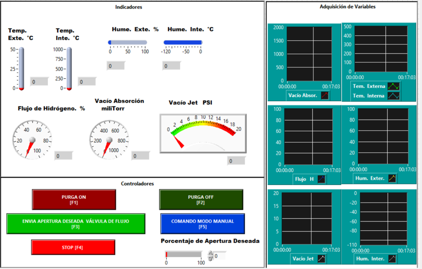 Como siguiente elemento se tiene la interfaz humana – máquina (HMI) implementada en el programa LabVIEW, ésta permite monitorear en todo momento el comportamiento de la temperatura, presión y humedad durante los diferentes procesos que se realizan durante el crecimiento de cristales por epitaxia en fase líquida, tal como se describió en la sección anterior [10]. El usuario hace uso de esta pantalla para activar o desactivar las diferentes válvulas neumáticas según el proceso que se necesite realizar. En la figura 2 se muestra la pantalla de control de la interfaz HMI implementada en LabVIEW.