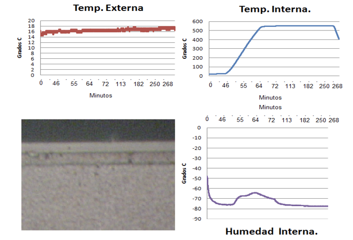 El endpoint 1 se utilizó para transmitir todos los datos provenientes de los sensores colocados en el sistema de crecimiento de cristales, así como para recibir los comandos ejecutados por la HMI de LabVIEW para activar o cerrar las válvulas neumáticas que permiten el flujo de gases en el sistema de LPE. Como se ha mencionado anteriormente resulta de vital importancia para el desarrollo del experimento y su posterior análisis, el monitorear y almacenar la temperatura interna del reactor, temperatura externa, humedad interna, humedad externa, presión, de flujo de gas hidrógeno, presión de vacío con las bombas de adsorción y tipo jet. En la figura 5 se puede observar algunas de las gráficas que se obtienen durante la realización del experimento y una imagen obtenida del recocido de un material crecido por epitaxia en fase liquido.