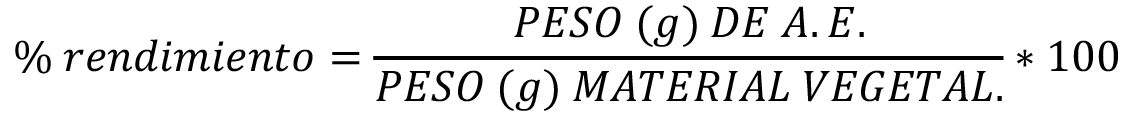 El rendimiento de los aceites esenciales con respecto a su biomasa vegetal se calculó por medio de la ecuación: