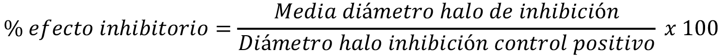 La actividad antimicrobiana de cada aceite esencial se evaluó por medio del método de difusión en pozo (perforación en gel de agar), en el cual se realizaron 6 perforaciones con un diámetro de 5,0 mm; la cepa de R. solanacearum se homogenizó en caldo nutritivo hasta alcanzar una concentración de 1*108 UFC/ml y se inoculó en la superficie de todo el medio; en cada uno de los pozos se colocaron 20 μl de los diferentes aceites esenciales a 24 concentraciones diferentes (500, 280, 240, 200, 180, 160, 140, 120, 100, 80, 60, 50, 40, 20, 10, 5.0, 2.0, 1.0, 0.5, 0.25, 0,10, 0,05, 0,025, 0,01 mg/mL), los aceites esenciales se diluyeron con acetona al 99%, como controles negativos se utilizó acetona y agua destilada, y como control positivo rifampicina; una vez inoculadas las cajas, se incubaron a 28º C durante 24 a 48 horas, posterior a la incubación se midió el halo de inhibición del crecimiento (mm) y se calculó para cada aceite esencial el porcentaje de efecto inhibitorio relativo, con respecto al control positivo con la siguiente ecuación [13], [14].